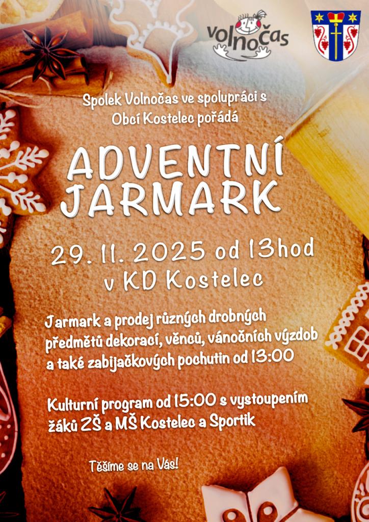 Spolek Volnočas ve spolupráci s Obcí Kostelec pořádá ADVENTNÍ JARMARK, který se koná v sobotu 29.11.2025 od 13:00 hod. v KD Kostelec.