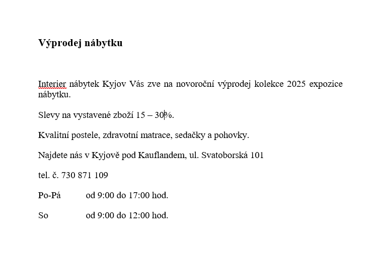 Interier nábytek Kyjov Vás zve na novoroční výprodej kolekce 2025 expozice nábytku. Slevy na vystavené zboží.