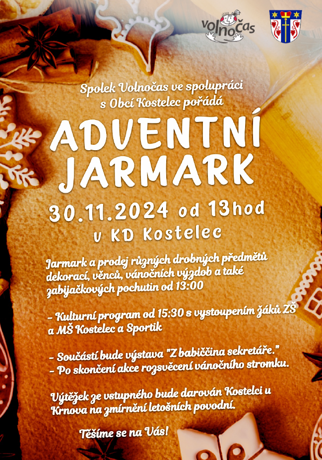 30.11.2024 Adventní jarmark spojený s ochutnávkou zabijačkových specialit, s posezením v Adventní cukrárně a s vánočním vystoupením MŠ, ZŠ a kroužku Sportík, nově s výstavou Z babiččina sekretáře